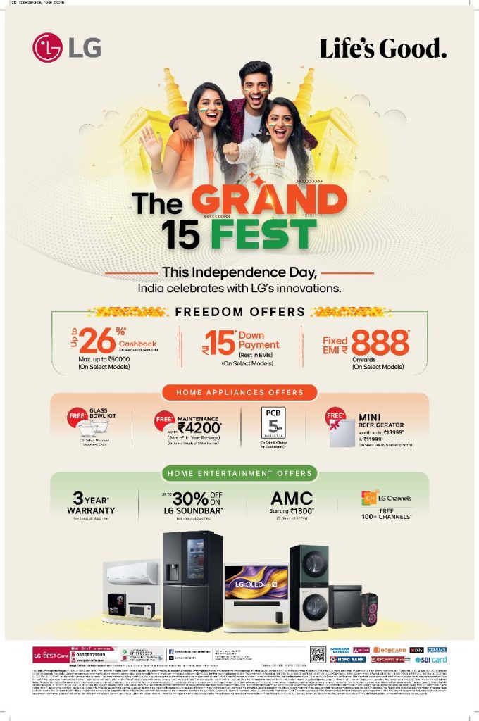 ग्राहकों को मिलेंगे नए और आकर्षक ऑफर्स नई दिल्ली: LG इलेक्ट्रॉनिक्स इंडिया ने स्वतंत्रता दिवस के मौके पर अपना नया कैम्पेन –’द ग्रैंड 15 फेस्ट’ पेश किया है। आजादी के इस खास मौके पर, LG अपने होम एप्लायंसेज और एंटरटेनमेंट…