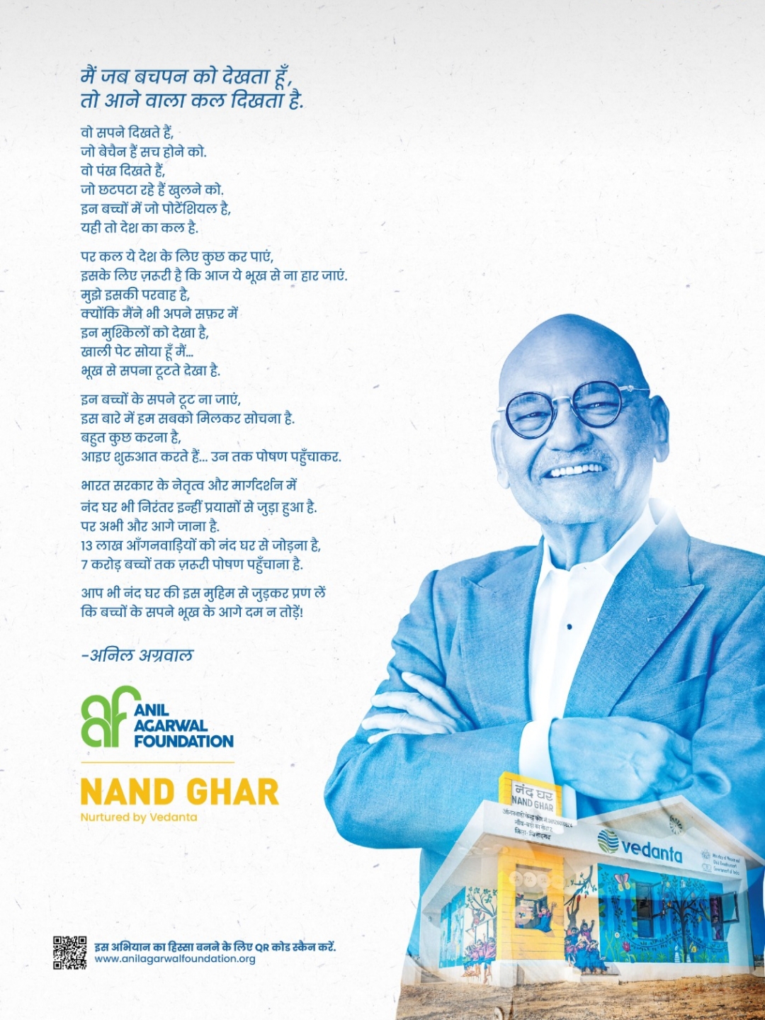 आफ अपनी प्रमुख सामाजिक परियोजना ‘नंद घर’ के माध्यम से, वेदांता और भारत सरकार के बीच एक सहयोगी परियोजना के तहत देश भर में भूख और कुपोषण को खत्म करने में अपना योगदान कर रहा है। इस परियोजना के अंतर्गत देश भर में 29,000 से अधिक आंगनबाड़ियों का विकास और आधुनिकीकरण किया जा रहा है। इसके तहत अब तक 5,500 आंगनबाड़ियों को नंद घरों के रूप में विकसित किया है, जहां समग्र विकास के अवसरों के माध्यम से बच्चों और महिलाओं के साथ साथ पूरे समाज के लिए बेहतर अवसर उपलब्ध हैं। भारत सरकार के पोषण अभियान और इस वर्ष के पोषण माह की थीम ’सुपोषित भारत, साक्षर भारत, सशक्त भारत’ के अनुरूप, नंद घर पोषण संबंधी जरूरतों को पूरा करने के साथ-साथ स्वास्थ्य, शिक्षा और सशक्तीकरण का समर्थन करने के अपने दृष्टिकोण का सच्चा प्रतीक बन गया है।