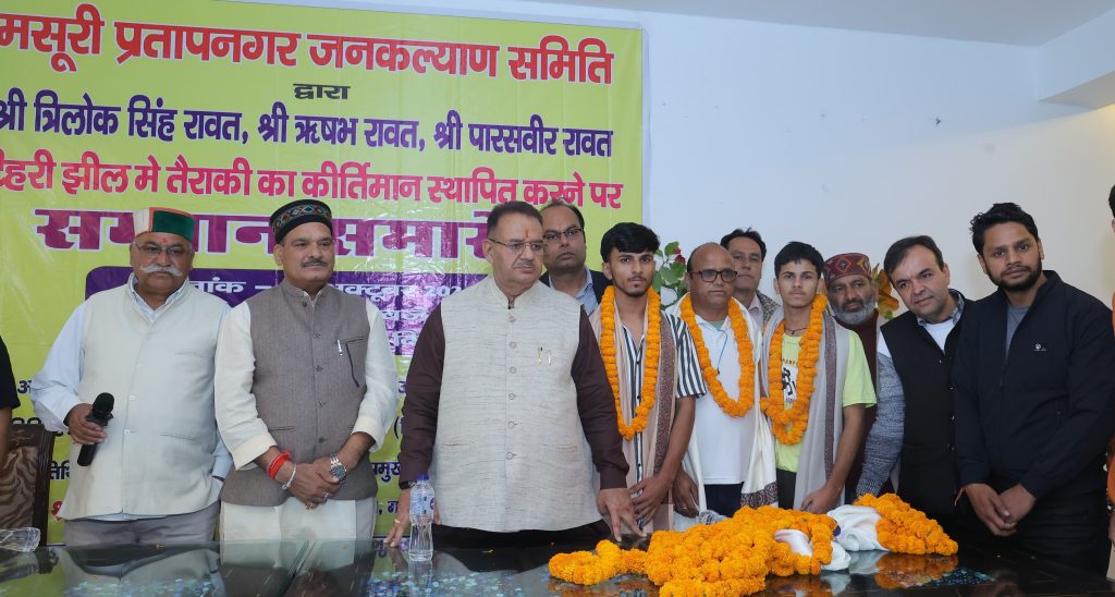 देहरादून, (देवभूमि जनसंवाद न्यूज़) मसूरी, कैबिनेट मंत्री गणेश जोशी ने सोमवार को मसूरी पहुंचकर एक निजी होटल में मसूरी प्रतापनगर जनकल्याण समिति द्वारा टिहरी झील में तैराकी का कीर्तिमान स्थापित करने वाले पिता पुत्रों के सम्मान में आयोजित सम्मान समारोह में बतौर मुख्य अतिथि प्रतिभाग किया। इस अवसर पर कैबिनेट मंत्री गणेश जोशी ने जनपद टिहरी के प्रतापनगर के मोटणा निवासी प्रतापनगर भाजपा के मंडल अध्यक्ष त्रिलोक सिंह रावत और उनके दोनों पुत्रों ऋषभ रावत और पारष रावत को सम्मानित किया।