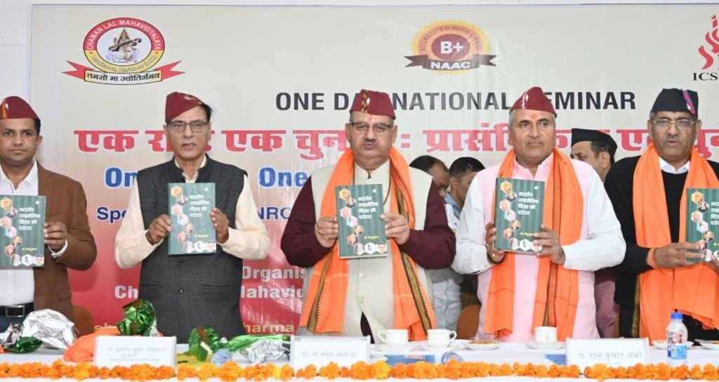 उन्होंने चमन लाल महाविद्यालय के इस मंच से में सभी देशवासियों से अपील करते हुए कहा कि प्रधानमंत्री का समर्थन कर देश में एक राष्ट्र एक चुनाव की नीति को लागू करने में अपना सहयोग और समर्थन प्रदान करें। इस दौरान मंत्री गणेश जोशी ने आयोजकों को आयोजन के लिए बधाई भी दी। कार्यक्रम के दौरान आयोजकों द्वारा मंत्री गणेश जोशी को रुद्राक्ष की माला और स्मृति चिन्ह देकर स्वागत एवं अभिनंदन भी किया। इस अवसर पर मंत्री गणेश जोशी ने चमन लाल महाविद्यालय राजनीति विज्ञान विभाग द्वारा लिखित ‘”भारतीय राजनीतिक चिंतन की परंपरा” पुस्तक का भी विमोचन किया।