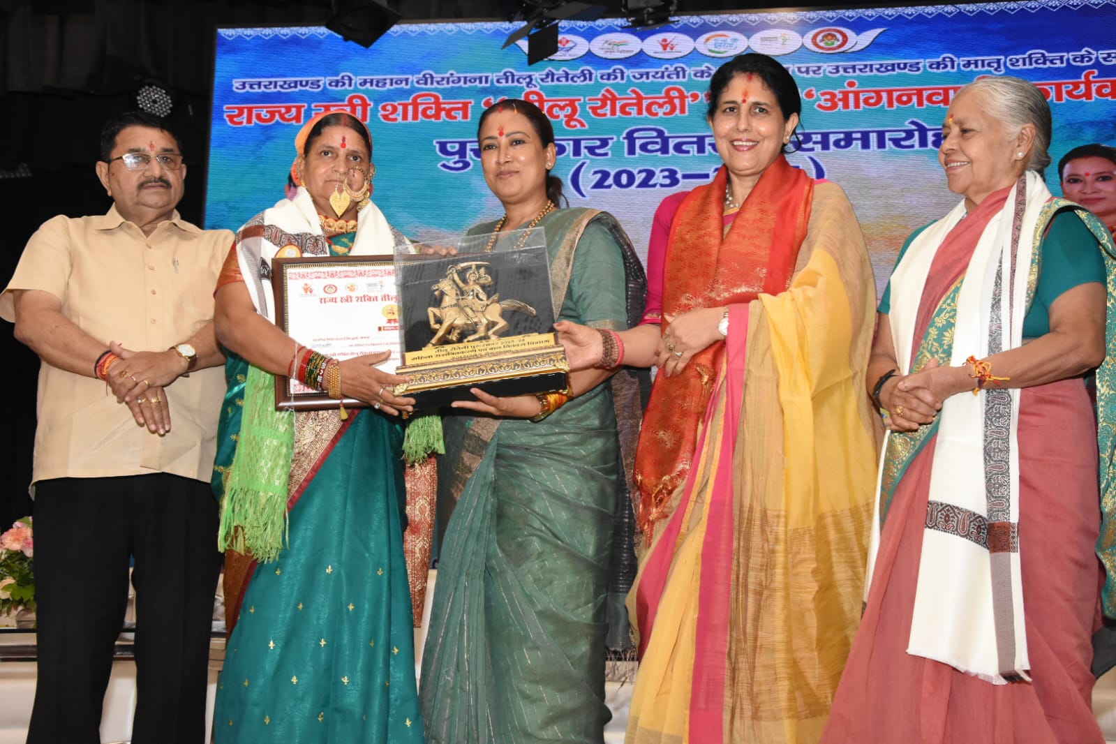 जबकि राज्य स्तरीय आंगनवाड़ी कार्यकत्री पुरूस्कार हेतु राज्य में न्यूनतम 05 वर्ष से निरन्तर कार्यरत् आंगनवाड़ी कार्यकत्री ध्मिनी आंगनवाड़ी कार्यकत्री जिनके केन्द्र पर ग्रामीण क्षेत्रों में 3 से 6 वर्ष के न्यूनतम 08 बच्चे एवं शहरी क्षेत्रों मे न्यूनतम 18 बच्चें पंजीकृत हो एवं समस्त लाभार्थी पोषण ट्रेकर एप में पंजीकृत हो। आंगनवाड़ी केन्द्रों का संचालन, केन्द्रों में अभिलेखों का उचित रख-रखाव, अनुपूरक पोषाहार का नियमित वितरण एवं जनसमुदाय को योजनाओं के प्रति जागरूक किया हो, कुपोषण उन्मूलन हेतु विशेष प्रयास किया हो एवं वर्ष में ग्रामीण स्वास्थ्य, स्वच्छता एवं पोषण दिवस का नियमित आयोजन किया हो, आगंनवाड़ी केन्द्र व केन्द्र के आस-पास की साफ सफाई पर विशेष ध्यान दिया हो, उनकी कार्यप्रणाली में बेहतर परिणाम एवं प्रतिस्पर्धा की भावना को बढ़ाने के उद्देश्य से इस पुरूस्कार में कार्यकत्री को रू0 51,000 की धनराशि आनलाईन, प्रमाण पत्र तथा स्मृति चिन्ह् प्रदान किया जाता है। कार्यक्रम में इस दौरान इस दौरान मुख्यमंत्री पुष्कर सिंह धामी ने वर्चुअल संदेश के माध्यम से समस्त तीलू रौतेली पुरस्कार विजेताओं और पुरस्कृत आंगनबाड़ी कार्यकर्ताओं को शुभकामनाएं देकर उनके उज्जवल भविष्य की कामना की। कहा कि राज्य की बालिकायें एवं महिलाएं पुरुस्कार प्राप्त विजेताओं के आदर्शों का अनुकरण करते हुए उत्तराखंड को नई ऊंचाइयों पर ले जाने में सहयोग करेंगी। उन्होंने कहा कि राज्य की महिलाएं बड़े सपने देखें व उनको सच करने का प्रयास करें, राज्य सरकार उनके साथ है। कार्यक्रम में रायपुर विधायक उमेश शर्मा काऊ, उपाध्यक्ष उत्तराखंड संस्कृति साहित्य एवं कला परिषद मधु भट्ट, निदेशक प्रशांत आर्य, पद्मश्री माधुरी बर्थवाल, उपनिदेशक विक्रम सिंह, मोहित चैधरी, सहित विभागीय अधिकारी,कर्मचारी,समस्त मातृशक्ति व आंगनवाड़ी बहनें उपस्थित रहीं।