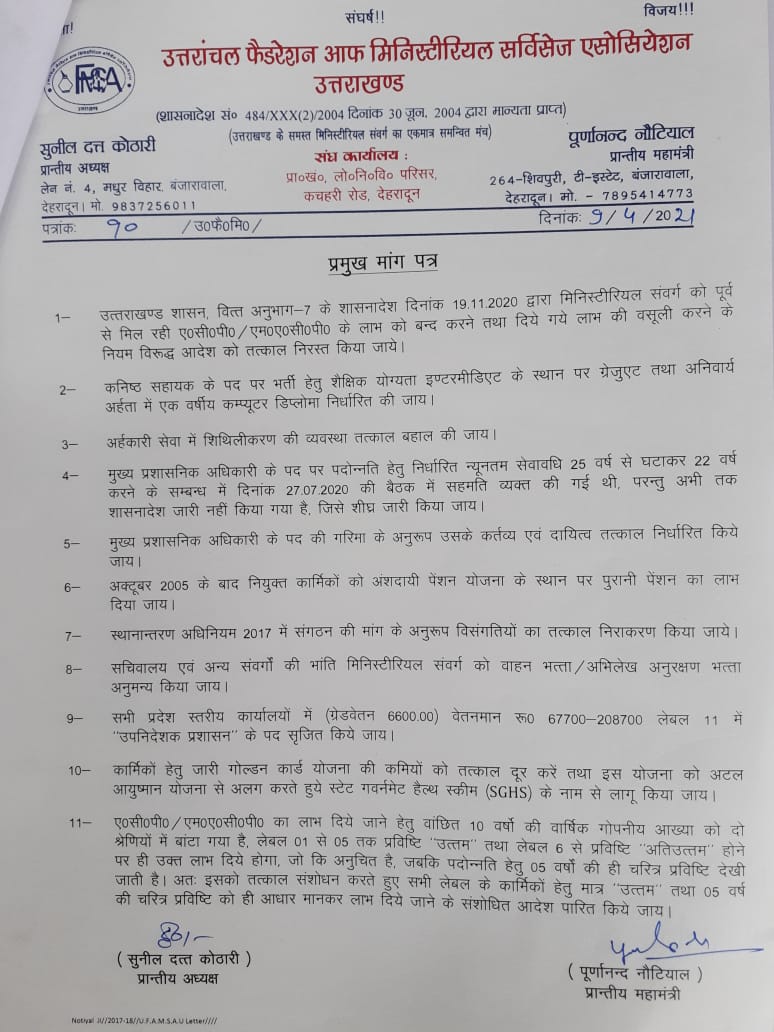 प्रान्तीय महामंत्री उतराँचल फैडरेशन आफ मिनिस्ट्रीयल सर्विसेज एसोसिएशन उतराखण्ड