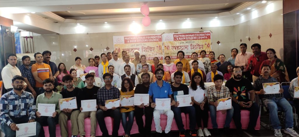 देहरादून। प्रथम श्वास फाउंडेशन, सिटीजन काउंसिल व पृथ्वीनाथ महादेव मंदिर सेवा दल की ओर से एक रक्तदान शिविर का आयोजन रेसकोर्स स्तिथ अमरीक हाल में किया गया जहां पर 63 यूनिट ब्लड एकत्र कर 189 लोगों को जीवनदान मिला। कार्यक्रम का उद्घाटन दून इंटरनेशनल स्कूल के ऑनर मिस्टर डीएस मान ब्रिगेडियर के जी बहल, डॉ बक्शी, श्वेता राय तलवार, सुनील अग्रवाल, जोगिंदर पुंडीर ,रविंद्र सिंह आनंद, डॉक्टर कृष्ण अवतार ,सोनिया आनंद , सिंधु गुप्ता , डॉ कौशिक, सतपाल जी, पूर्व विधायक राजकुमार , अशोक वर्मा , डॉ तृप्ति जुयाल सेमवाल , जैसल जी सुभाष जोशी , मोंटी कोहली जी ने दीप प्रज्वलन कर विधिवत आरंभ किया । कार्यक्रम के संयोजक अनामिका जिंदल व संजय गर्ग ने बताया कि यह शिविर स्वर्गीय अनुराग अग्रवाल जी को श्रद्धांजलि स्वरुप श्री गुरु राम राय हॉस्पिटल के सहयोग से लगाया गया । शिविर में सभी रक्त वीरों को सर्टिफिकेट देकर सम्मानित किया गया वहीं यूपीएस कॉलेज के स्टूडेंट्स जो कि कार्यक्रम को वॉलिंटियर कर रहे थे उनको भी सम्मान स्वरूप सर्टिफिकेट फॉर गिफ्ट प्रदान किए गए । इस मौके पर शिविर में प्रिया गुलाटी ,मंजू ,भक्ति ,सुमन, बबीता ,इंदु ,रमा ,ऊषा, प्रवीण, नैंसी, अरुणा ,शशि, मोना ,नवीन, कान्हा ,विक्की ,अमित ,तुषार, अरुण ,दीपक ,अखिलेश ,रोशन राणा ,अंकुर ,प्रदीप ,रविंद्र ,गणेश प्रेम, दिनेश, हरी ,राजेंद्र ,रितु, दुग्गल, सुमित , बालक नाथ जी आदि मौजूद रहे। इन्हीं के साथ अमूल्य वर्मा ,मृत्युंजय ,आयुषी, अश्विन ,आर्यन सिंह ,अलीशा, अनुनय ,अनुज ,अमन ,आर्यन, भावेश ,अतिशय ,दिवांश ने भी कार्यक्रम में बढ़-चढ़कर सहयोग किया।
