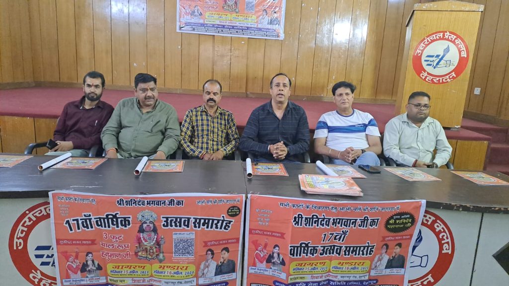 देहरादून । हर वर्ष की भांति इस वर्ष भी शनि सेना सेवा समिति (रजि0), देहरादून द्वारा श्री शनिदेव भगवान का 17वाँ वार्षिक उत्सव समारोह 15 अप्रैल एवं समय सायः 9ः00 बजे एवं विशाल भण्डारा 16 अप्रैल एवं समय प्रातः 11ः00 बजे का आयोजन सहारनपुर रोड़ स्थित श्री शिवाजी धर्मशाला, देहरादून में प्रभु की इच्छा से होना तय हुआ है । बुधवार को प्रेस क्लब में आयोजित प्रेस वार्ता में शनि सेना सेवा समिति ने कहा कि इस वर्ष के वार्षिक उत्सव समारोह में गायक विक्की फिरोजपुरिया (कैथल-हरियाणा), इति वर्मा (बठिंडा- पंजाब), पवन कपूर (पानीपत हरियाणा ) अपनी हाजिरी लगायेगें एवं कार्यक्रम में मंच का संचालन अनिल अनुरागी (यमुनानगर ) द्वारा किया जायेगा। इस बार के वार्षिक उत्सव समारोह में विशेष आकर्षण का केन्द्र न्याय प्रिय श्री शनिदेव महाराज झुलें पर विराजमान होगें तथा तीन फुट के बाल रूप श्री हनुमान जी महाराज भक्तों को आकर्षित करेंगें दिनांक 16 अप्रैल 2023 को होने वाले भण्डारें में लगभग दस हजार व्यक्तियों के भण्डारे का आयोजन किया गया हैं। इस मौके पर समिति के अध्यक्ष रामकुमार गुप्ता, सचिव केवल सिंह पुण्डीर एवं कोषाध्यक्ष श्रवण कुमार तथा राजेश गुप्ता, सन्नी कंसल, ललित माटा, विशाल शर्मा, दिनेश तिवारी, लोकेश सकलानी, सतीश कश्यप, महेन्द्र मल्हौत्रा, संजीव सिंघल, अनन्त सागर गिरि, संजय मुनियाल, प्रेम कश्यप, आकाश गुप्ता, निशान्त गुप्ता, अमन गुप्ता, निहाल धीमान, विरल चौहान, अमन जैन, हन्नु, विनय, सावन, नवीन, सुमित, सचिन, राहुल आदि उपस्थित रहें।